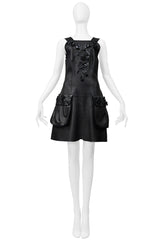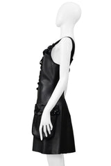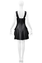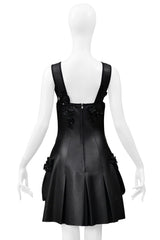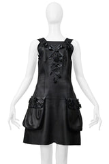 Resurrection Vintage is excited to offer a 2017 Fendi by Karl Lagerfeld black leather jumper dress. The dress features black leather straps, decorative patent flowers and bows on the bodice, pockets, and straps, front pockets, a center back zipper, and a length that falls above the knee.