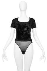 Resurrection is excited to offer a vintage Gianfranco Ferre black velvet bodysuit featuring a scoop neck, short sleeves, snap crotch, sheer bottom, and side zipper.
