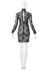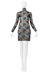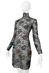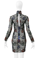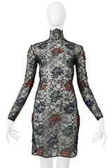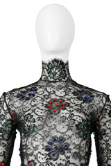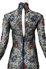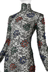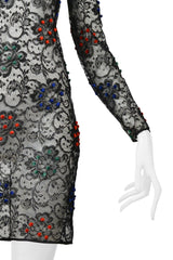 GALANOS BLACK LACE DRESS WITH RED, BLUE & GREEN VELVET POM POMS