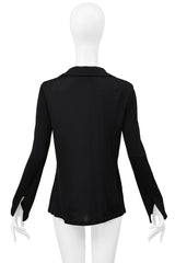 Resurrection Vintage is excited to offer a stunning vintage Tom Ford for Gucci 1997 black jersey top featuring a low cut neckline with cowl, pointed collar, slit cuffs, and hip length.