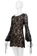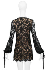 Resurrection Vintage is excited to offer a stunning vintage Tom Ford for Gucci black lace mini-dress featuring balloon sleeves with wrist ties, attached nude under slip, and scalloped edges. It was featured on the 1996 runway and in numerous fashion editorials by Bruce Weber, Ellen Von Unwerth, Mario Testino, and more. This dress has never been worn and has original tags.