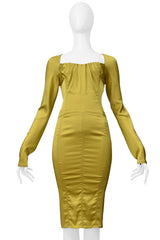 Resurrection Vintage is excited to offer a stunning gold 2003 Tom Ford for Gucci corset dress featuring a pleated corset-shape neckline and bodice, long sleeves, satin fabric with stretch, girdle skirt detailing, center back zipper, and knee length.