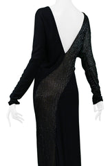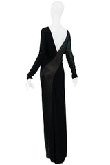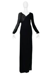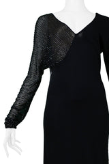 Resurrection Vintage is excited to offer a vintage black jersey Halston gown with asymmetrical beaded panels, low neckline, long sleeves, and slit.