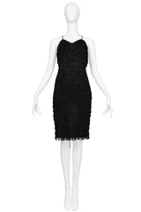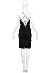 Resurrection Vintage is excited to offer a vintage black fringe Katharine Hamnett "wiggle" dress featuring skinny straps, fitted body, knee-length, and a lace-up back.