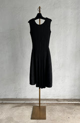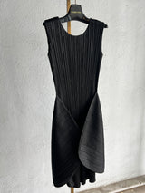 Resurrection Vintage is thrilled to present a vintage Issey Miyake black pleated dress with black panels from the spring 2005 collection, featuring a round neck and sleeveless design, midi length, back panels that can be worn unbuttoned, and below-the-knee length.