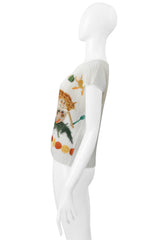 Resurrection Vintage is excited to offer a vintage Issey Miyake pleated graphic print top from the spring 2004 collection, featuring imagery of fruits, vegetables, and characters, short-sleeved, and a classic crew neck.
