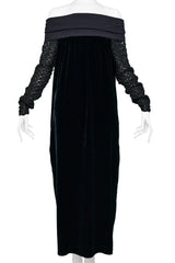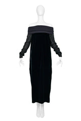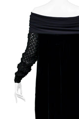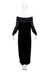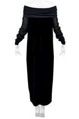 Resurrection Vintage is excited to offer a vintage Jean Paul Gaultier black velvet dress featuring an off-the-shoulder collar, chunky knit sleeves, easy body, and ankle length.
