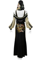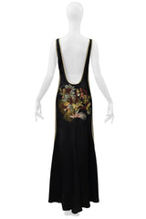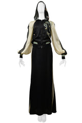 Resurrection Vintage is excited to offer a vintage Jean Paul Gaultier black and cream satin ensemble with mesh stripes from 2007 30th anniversary collection. The ensemble includes a zip front jacket and long satin dress. The ensemble features embroidery detailing on the back of the dress, front and hood of the jacket, an open back on the jacket and dress, and see-through mesh detailing on the sides of the dress and sleeves.