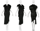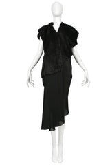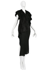 Resurrection Vintage is excited to offer a vintage Junya Watanabe black crepe drape dress featuring faux fur panels, v neckline, asymmetrical hemline, soft shoulders, shawl sleeves, and easy skirt.