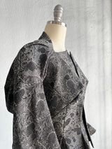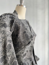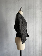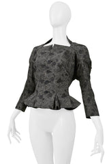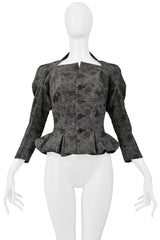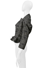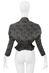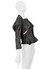 Resurrection Vintage is thrilled to offer a vintage Junya Watanabe grey floral jacquard rubber neoprene jacket from the 1999 collection, featuring a portrait collar, curved side zipper that can be undone to create a slashed effect, and a peplum hem. The jacket can also be unzipped and folded for easy carrying. See photo below. Please also see studio and natural photos below.