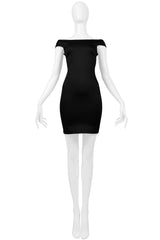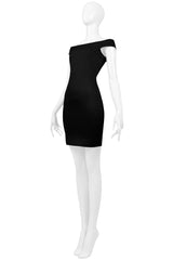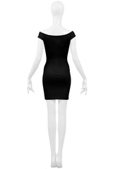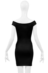 Resurrection Vintage is delighted to offer a vintage Katharine Hamnett black mini dress featuring a cold shoulder, stretchy body-con fit, and darts under cups.