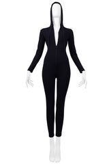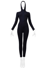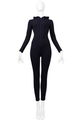 Resurrection Vintage is delighted to offer a vintage Katharine Hamnett dark navy jersey jumpsuit with stretch featuring a center front zipper, and hood.