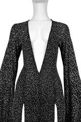 Resurrection Vintage is excited to present a Katy Rodriguez black stretch jersey jumpsuit featuring deep slits at the neckline, sleeves, and legs, and silver glitter.