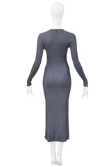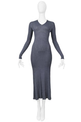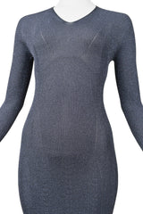 Resurrection Vintage is thrilled to present a vintage Lanvin by Alber Elbaz metallic lurex knit long dress. It features a subtle V-neck, long sleeves, ribbed knit detailing, and midi length.