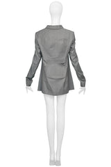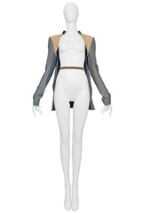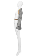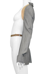 Resurrection Vintage is excited to offer a vintage Maison Martin Margiela grey deconstructed blazer with nude padded shoulders, cut-out front, reinforced back panel, extra-long sleeves, and brown grosgrain belt.