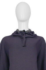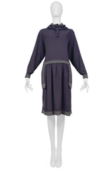 Resurrection Vintage is excited to offer a vintage Issey Miyake navy blue dress featuring grey trim, drawstring collar, and knee-length.