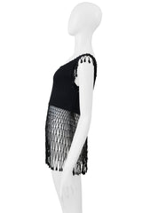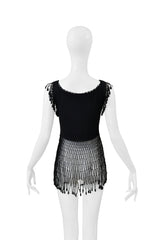 Resurrection Vintage is delighted to offer a vintage Moschino black knit top with netting and beading, featuring a scoop neck, sleeveless, and beading at the shoulders.