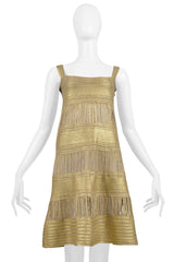 Resurrection Vintage is excited to offer a vintage Moschino gold painted dress featuring fringe cutouts, textured line detailing, and a bold neckline with thick straps.