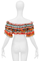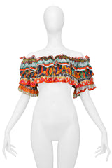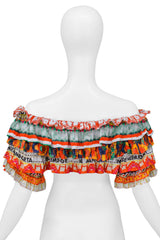 Resurrection Vintage is excited to offer a vintage Moschino multicolor crop top featuring layered ruffles and an off-the-shoulder neckline.