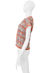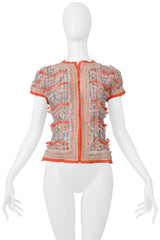 Resurrection Vintage is excited to present a Nina Ricci pink and red chiffon cropped top, featuring a round neck, short sleeves, a front hook-eye-closure, embellishments, and hip length.
