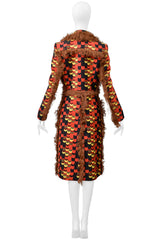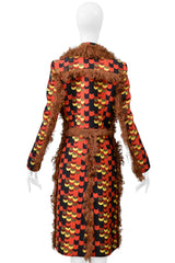 PRADA RED MULTICOLOR GRAPHIC PRINT COAT WITH ORANGE SHEARLING TRIM 2014