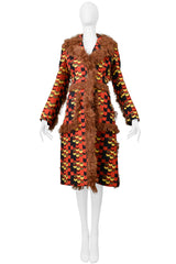 Resurrection Vintage is excited to offer a Prada red, yellow, and multicolor mod-inspired coat featuring a bold graphic print, long curly orange shearling trim, side flap pockets, center button closure, full lining, and knee length.