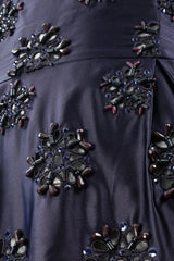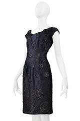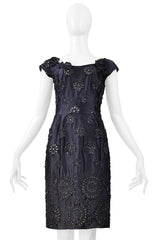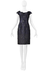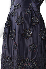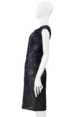 PRADA MIDNIGHT BLUE TAFFETA DRESS WITH HEAVY EMBROIDERY, BEADING AND LASER CUTOUTS