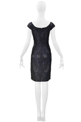 Resurrection Vintage is thrilled to offer a classic vintage Prada dark midnight blue taffeta dress featuring intricate floral-shaped embroidery and beading, laser cuts, cap sleeves, center back zipper closure, and knee-length.
