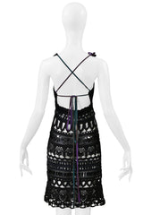 Resurrection Vintage is thrilled to offer a vintage Prada crochet dress featuring knit purple and green halter straps, geometric paillettes, unlined, hidden zip closure, and above the knee length, and an open back.