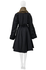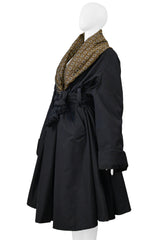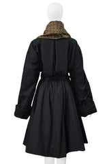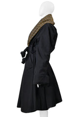 Resurrection Vintage is excited to present a vintage Romeo Gigli black iridescent coat from the 1990s, featuring a chic voluminous fit, a large sash belt with knots, side pockets, a gold-tone paisley shawl collar, and a hemline that falls below the knee.