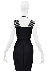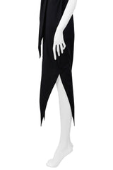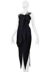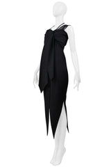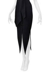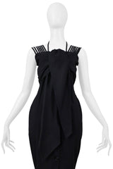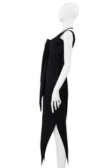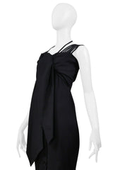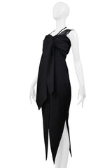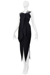 Resurrection Vintage is excited to offer a vintage Romeo Gigli black cold shoulder dress with stretch featuring a button front closure, an attached scarf at the bust, multiple shoulder straps and neck strap, a tailored waistline, and pointed hem.