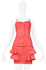 Resurrection Vintage is excited to offer a vintage rose pink Byblos silk tank top with button front, criss-cross straps and a matching pink skirt with ruffles at back and sides. Circa, 1992.