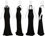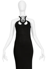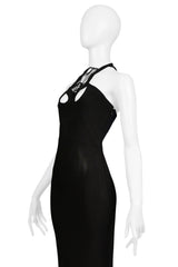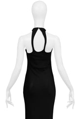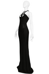 Resurrection Vintage is excited to offer a stunning vintage Sophia Kokosalaki architectural black jersey evening gown featuring an intricate lattice collar detail at the yoke and bodice, sexy front and back cutouts, a fitted body, a side zipper, and dramatic evening gown length.