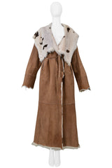 Resurrection Vintage is excited to offer a vintage brown spotted reversible llama fur coat, featuring a shawl collar that shows the interior spotted design, front button closures, a tie sash at the waist, side pockets, and an ankle-length design.