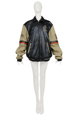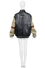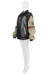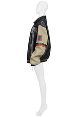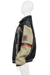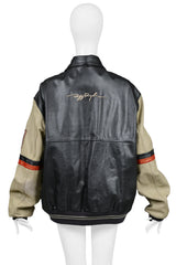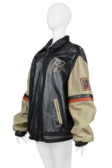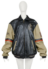 Resurrection is offering a vintage unisex leather bomber by Ruff Ryders with a color block design, patches, and embroidery. This varsity bomber jacket is fully lined with quilted satin and has interior and exterior pockets.