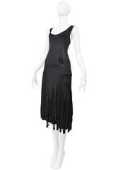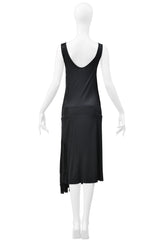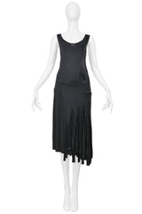 Resurrection Vintage is excited to offer a vintage Veronique Branquinho black jersey tank dress featuring a deep asymmetrical neckline, black beading, fringe detailing, a dropped waistband, and an asymmetrical hem.