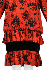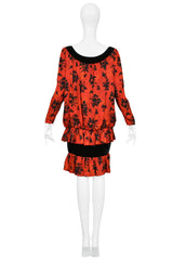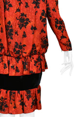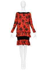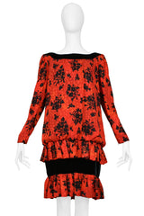 YVES SAINT LAURENT YSL RED & BLACK FLORAL PRINT DROP DRESS 1980s