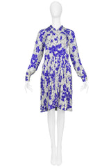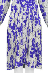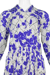 Resurrection Vintage is excited to offer a vintage purple floral print Yves Saint Laurent white silk day dress with pleats. The dress features a button front neck, straight sleeves, and knee-length.