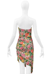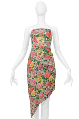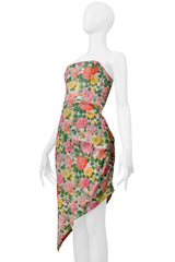 YVES SAINT LAURENT STRAPLESS FLORAL COTTON DRESS WITH ASYMMETRICAL HEMLINE