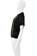 Resurrection Vintage is thrilled to offer a vintage Comme Des Garçons black sweater with a camo stripe from the 2001 Collection, featuring an asymmetrical neck, short sleeves, lightweight fabric, and an off-center camo panel at the front and back of the sweater.