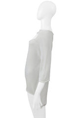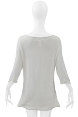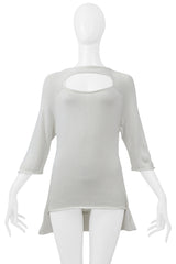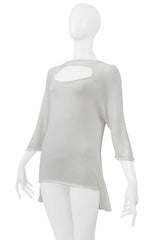 Resurrection is excited to offer a vintage Yohji Yamamoto lightweight white high-low sweater with a cutout from the spring 2001 collection, featuring a straight neckline, three-quarter sleeves, and an easy fit.