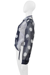 Resurrection is excited to offer a vintage Y's by Yohji Yamamoto black and white polka dot wrap top from the spring 2001 collection, featuring a single button closure at the top, collared neckline, long sleeves, sheer fabric, and ties near the hem that can create an overlapping wrap effect.