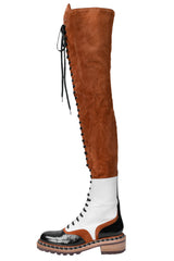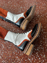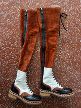 CHANEL BROWN SUEDE AND WHITE LEATHER SALZBURG BOOTS 2015