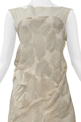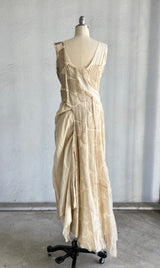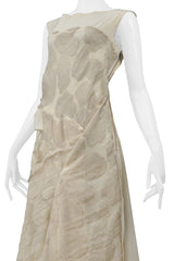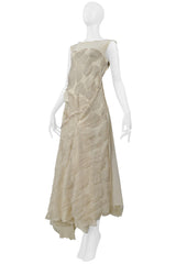 Resurrection Vintage is excited to offer a vintage Comme des Garçons off-white organza and muslin gown featuring a vintage organza top with a gold lame floral design, a muslin underdress, and a layered skirt with a deconstructed body, a side zipper, an asymmetrical hem, and an ankle-length design. Please see photos below in studio and natural light.