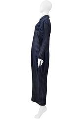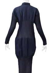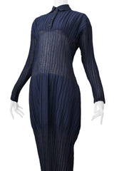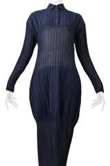 Resurrection Vintage is excited to present a vintage Issey Miyake indigo blue tubular pleated dress from the 1998 collection, featuring long sleeves, a folded "polo style collar and placket with buttons, sheer paneling, exaggerated curves, and a tapered hem.