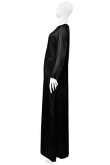 Resurrection Vintage is excited to showcase a vintage Maison Martin Margiela black satin evening gown featuring a high neckline, circular armholes, long sleeves, a relaxed body with a slight A-shape at the hem, a keyhole back neck detail, and iconic Margiela stitching at the center back. Please see studio and natural light photos below.