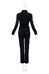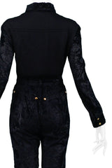 Resurrection Vintage is excited to offer a vintage Gianfranco Ferre black faux fur velvet bodysuit and pant ensemble. The bodysuit top features gold buttons at center front and black double knit panel at back. The pants are high waisted with a straight leg cut and center front zipper and gold button closure.