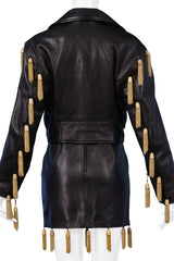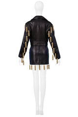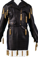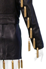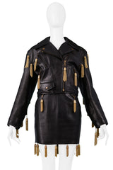 MOSCHINO BLACK LEATHER SKIRT SUIT WITH GOLD CHAIN TASSELS 1989