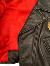 Resurrection Vintage is excited to offer a vintage Moschino by Franco Moschino black leather motorcycle jacket and skirt. Both pieces feature gold thimbles with gold chains. Like new condition. Circa 1989.