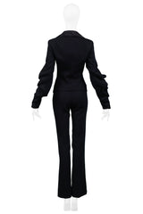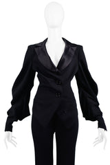 Resurrection Vintage is excited to offer a vintage Emanuel Ungaro black suit jacket and trouser ensemble. The jacket features a plunging neckline, black satin collar, gathered button front closure, and dramatic bishop sleeves. The pants are high waisted with a slightly flared cut.